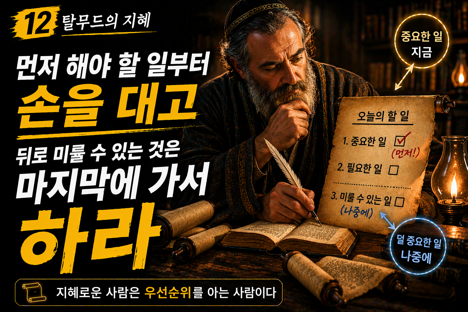 12 : 먼저 해야 할 일부터 손을 대고 뒤로 미룰 수 있는 것은 마지막에 가서 하라.